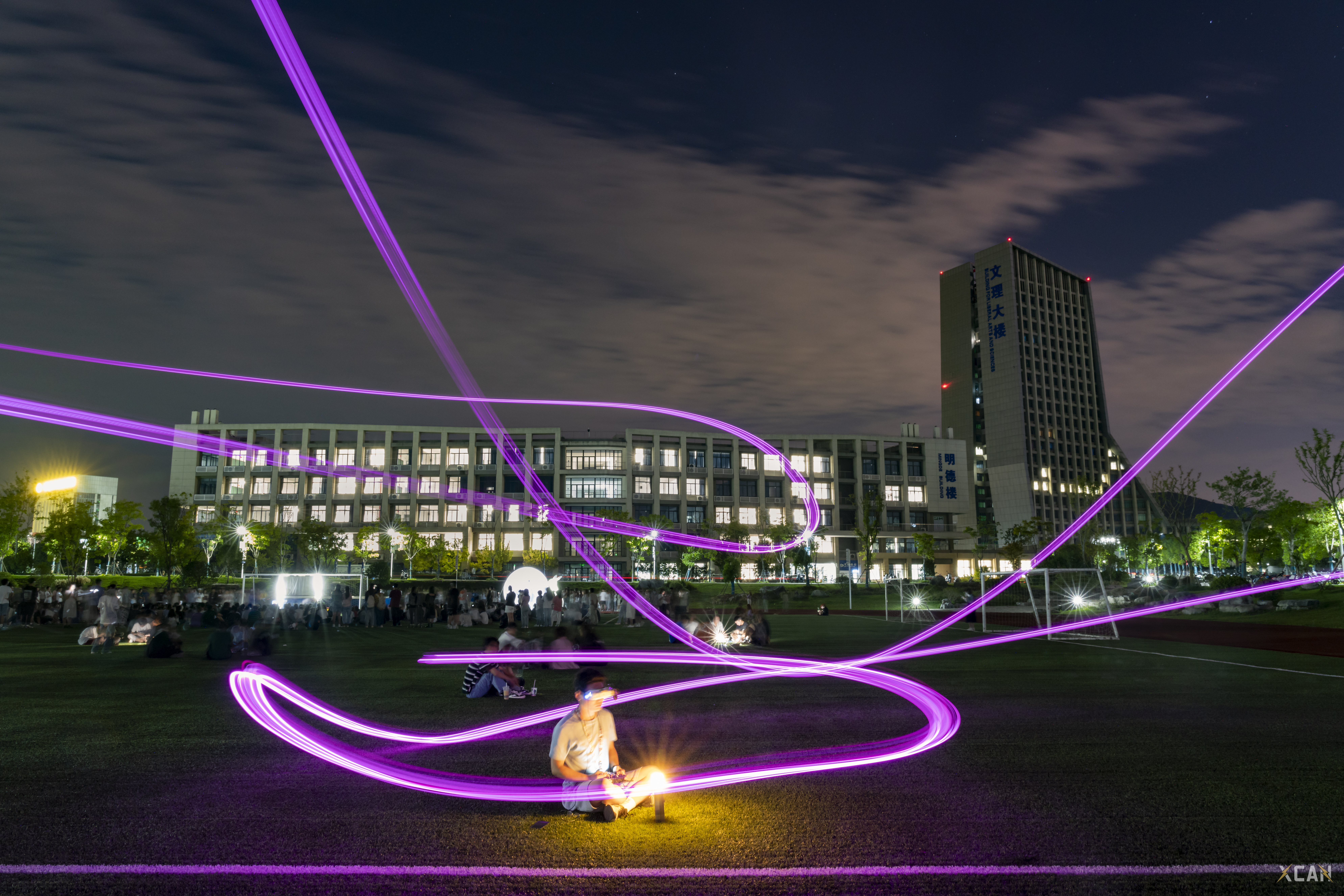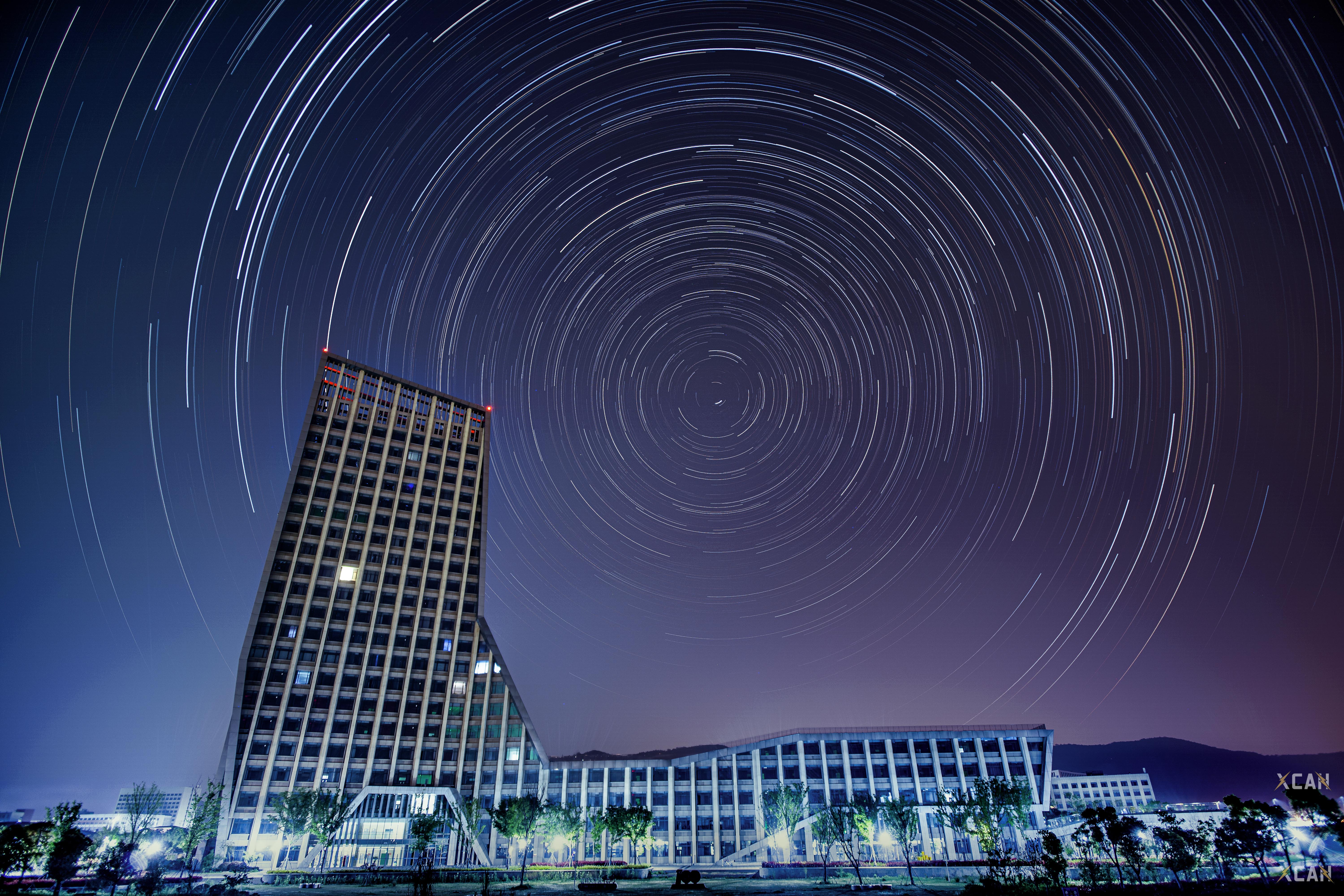 拍摄了上千张照片,夏灿最满意的是在长山校区文理大楼前拍摄的星轨图,拍摄星轨的过程可谓是困难重重!拍摄有时天公不作美,原本白天万里无云的天气一到夜晚便就乌云密布,有时由于光污染严重便只能放弃拍摄......历经千辛万苦,终于,在一个晴朗的夜晚,他成功捕捉到了那梦幻般的星轨,后来那些照片被放进学校2024年日历中。