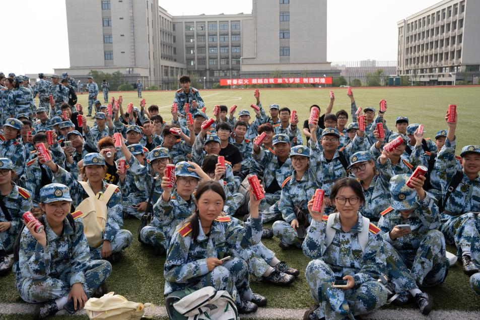 志愿者们早已将一箱箱定制可乐整齐地摆放在训练场边,每一瓶可乐上都清晰地印着对应新生的姓名,这份专属的小细节让同学们感受到了学院的用心。志愿者们来自各年级的学长学姐,他们身着红色志愿服,迅速穿梭在各个军训队列之间,将可乐递到大家手中。红色的志愿身影在蓝色的军训服中格外显眼,如同夏日里的阵阵清风,为炎热的训练场带来了别样的清凉。