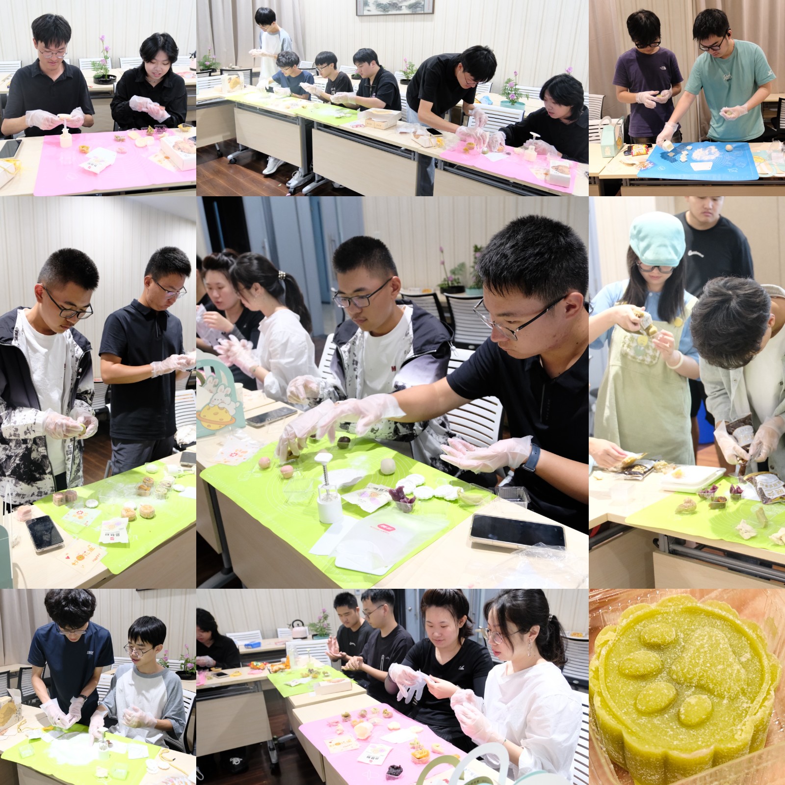 活动最后,迎来了最令人期待的手工制月饼环节。长桌之上,各色馅料与精巧模具整齐排布,琳琅满目的月饼材料瞬间勾起大家的创作热情。大家纷纷戴上一次性手套,跃跃欲试。对许多同学来说,这是人生中第一次亲手制作月饼,全新的体验让大家充满新鲜感。这些带着温度的月饼,不仅凝聚着参与者的巧思,更承载着每个人对中秋佳节的热爱,以及对生活最真挚的美好期许。