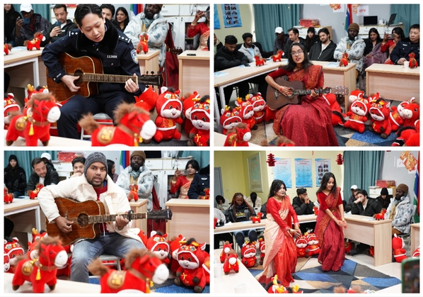 现场,传统与现代交相辉映,文化与情感彼此交融。留学生兼职辅导员、镇江市出入境管理支队马博文警官抱起吉他,一曲英文歌轻柔流淌,音符跨越语言,温暖直抵人心。留学生们也毫不怯场,中文歌弹唱、音乐串烧、即兴舞蹈……多元才艺轮番登场,他们用多元文化演绎对中国新年的热爱与祝福。