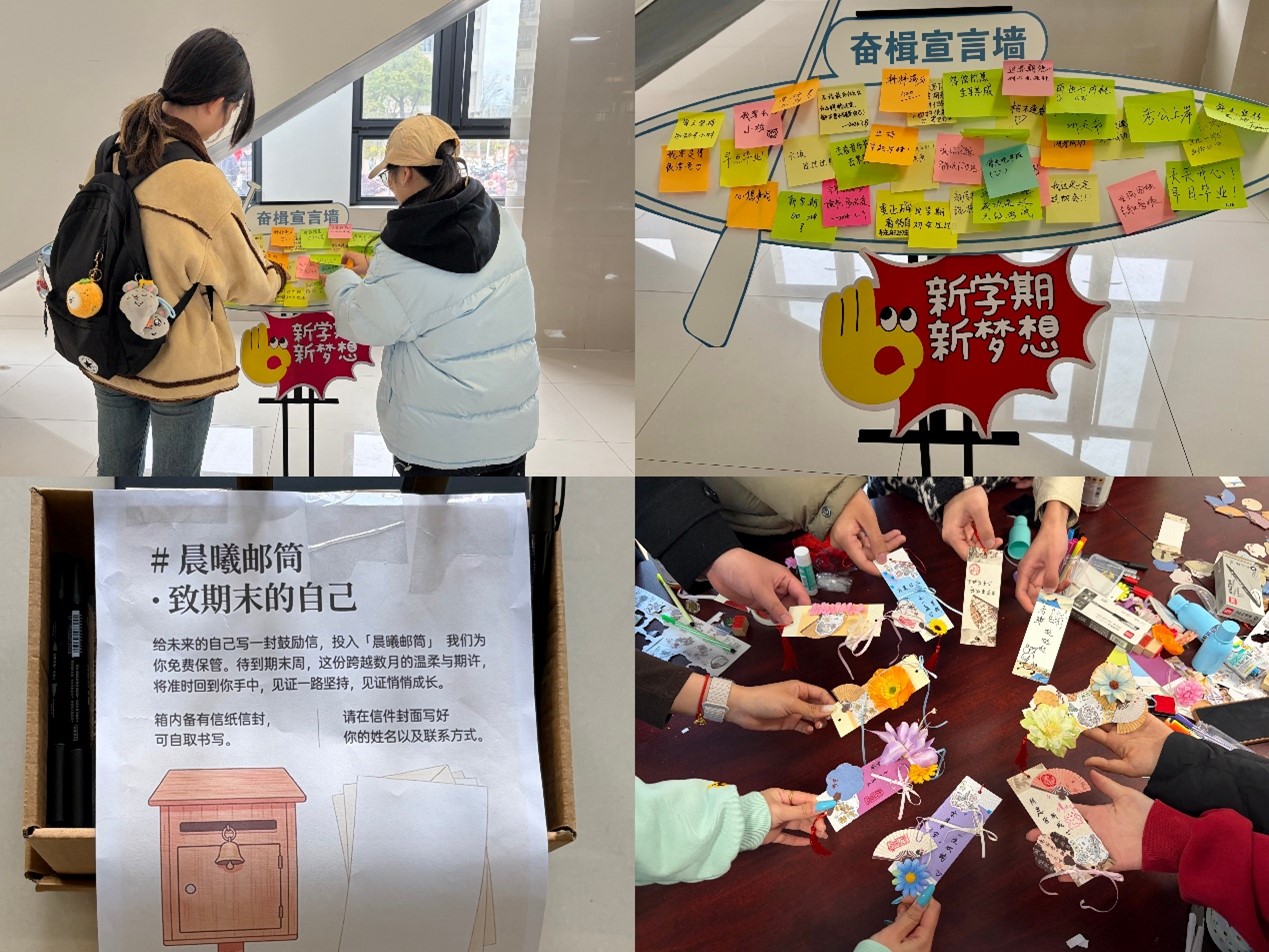 笔墨寄情,写下致期末的自我期许。学院心理气象站在食堂设置了船桨形状的“奋楫宣言墙”,同学们在彩色便签上写下新学期奋斗目标:“六级过过过!”“我这次一定过初会!”“新学期拒绝拖延症!”……一张张便签贴成船桨形状的“奋楫墙”,寓意着扬帆起航的决心。一旁的“晨曦邮筒”则成为连接现在与未来的纽带,同学们写下“致期末的自己”的鼓励信,由学院统一保管,期末考试前一周寄还本人,见证成长。周末的励志书签DIY工作坊,大家亲手制作书签,将清晨故事中提炼的格言化为案头箴言,互相交换,传递奋斗能量。这一系列表达与仪式,帮助学生将抽象的目标具象化、公开化,强化内驱力,为学风建设注入精神动力。